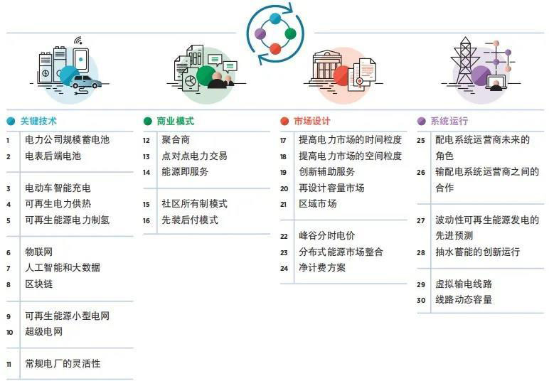 在解決 VRE 并網(wǎng)發(fā)電問題時,我們并不缺乏創(chuàng)新。IRENA 對高比例 VRE 并網(wǎng)發(fā)電的創(chuàng)新舉措進行了調(diào)研。通過調(diào)研分析找出了 30 種四大類電力行業(yè)轉(zhuǎn)型創(chuàng)新舉措:關(guān)鍵技術(shù)創(chuàng)新、商業(yè)模式創(chuàng)新、市場設(shè)計創(chuàng)新和系統(tǒng)運行方式創(chuàng)新。