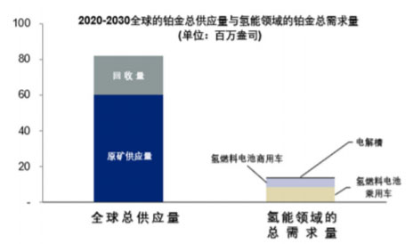 圖3未來(lái)十年鉑金總供應(yīng)量與來(lái)自氫能領(lǐng)域的鉑金總需求量的對(duì)比圖(預(yù)測(cè)基于E4tech建議的鉑載量上限)