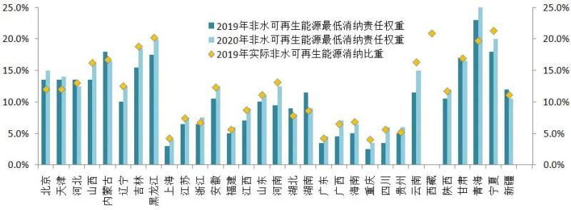 圖1 非水可再生能源2019年電量占比、2019和2020年消納保障機制目標(biāo)(數(shù)據(jù)來源:國家能源局)