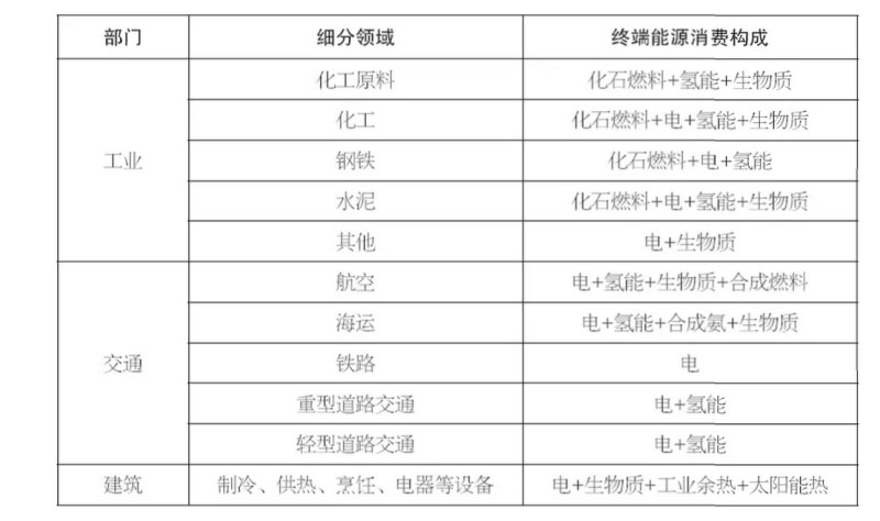 2.交通部門。為了實(shí)現(xiàn)我國交通部門的碳中和,需要將路面運(yùn)輸(公路和鐵路服務(wù))全面電氣化,同時長途航空和船運(yùn)改用零碳燃料(氫氣、氨等)。1)路面交通。目前,我國高鐵已基本實(shí)現(xiàn)了全面電氣化,普通速度的鐵路交通在未來也將逐步實(shí)現(xiàn)全面電氣化。純電動汽車將在未來主導(dǎo)中短距離的交通出行,而氫燃料電池汽車則會在長距離貨運(yùn)卡車和重型卡車中占據(jù)主要地位。2)航空和海運(yùn)。針對航空海運(yùn)領(lǐng)域,直接應(yīng)用電氣化實(shí)現(xiàn)碳中和的空間較小,因此,航空和海運(yùn)交通的脫碳則必須主要依靠零碳的新型燃料。對于航空領(lǐng)域,依靠生物航空燃油和合成航空燃油是實(shí)現(xiàn)碳中和的主要技術(shù)路徑。此外,未來需要使用生物燃料和氨對船運(yùn)領(lǐng)域進(jìn)行深度脫碳。綜上,零碳電能、氫能、航空燃油、生物燃料和氨等多種綜合能源的使用將會進(jìn)一步加速我國碳中和目標(biāo)的實(shí)現(xiàn)。