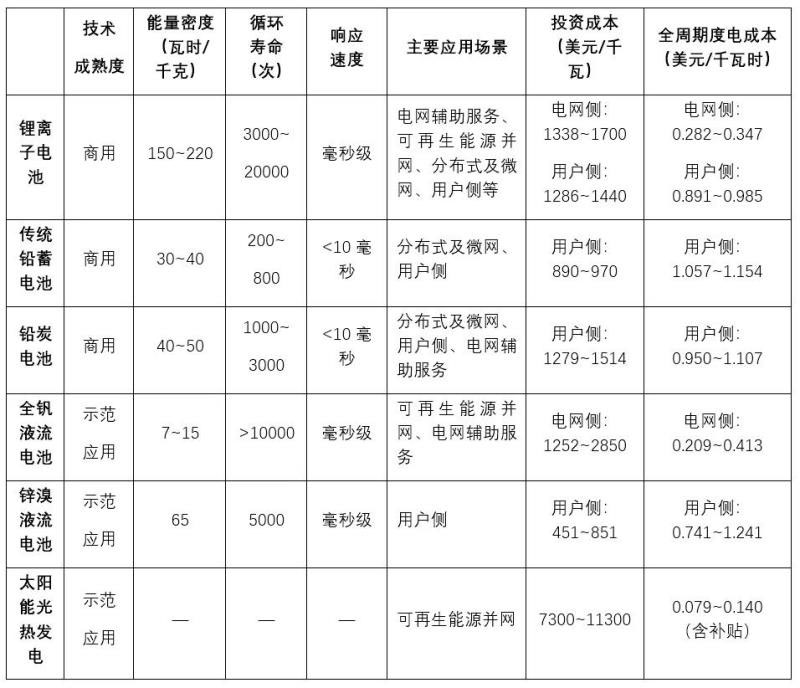 綜合對比技術(shù)與經(jīng)濟指標、產(chǎn)業(yè)應用情況,關(guān)于電化學儲能技術(shù):鋰離子電池綜合性能較好,應用場景綜合,成本下降較快,裝機占比大,未來仍將是美國儲能產(chǎn)業(yè)發(fā)展的重點;鉛蓄電池性能較差,應用場景受限,成本下降空間小,裝機占比小,傳統(tǒng)鉛蓄電池將逐漸被取代,鉛炭電池性能有所提升但競爭力有限;液流電池技術(shù)成熟度、商業(yè)化程度較低,裝機占比小,短期內(nèi)大規(guī)模應用可能性不高。關(guān)于儲熱技術(shù):太陽能光熱發(fā)電是唯一可同時實現(xiàn)友好并網(wǎng)與有效調(diào)峰的可再生能源發(fā)電技術(shù),調(diào)節(jié)性能良好,是美國應用規(guī)模最大、最為成熟的儲熱技術(shù),但受投資成本和占地面積所限,大規(guī)模應用仍需大幅降低成本和依靠政策支持。
