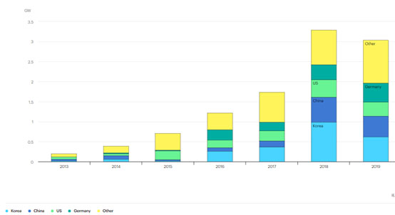 韓國的年裝機(jī)容量在2018年創(chuàng)下紀(jì)錄后下降了80%,當(dāng)時(shí)韓國占全球儲(chǔ)能裝機(jī)容量的三分之一。下降的原因是人們?cè)絹碓綋?dān)心2018年電網(wǎng)規(guī)模的儲(chǔ)能工廠發(fā)生的幾起火災(zāi)。盡管對(duì)火災(zāi)和安全措施進(jìn)行了大規(guī)模審查,但2019年又發(fā)生了5起火災(zāi)。
