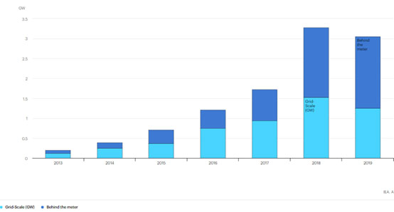 2019年,全球電力系統(tǒng)新增了2.9 GW的儲(chǔ)能容量,比2018年減少了近30%。這一趨勢(shì)背后的因素表明,儲(chǔ)能技術(shù)在很大程度上仍處于早期階段,目前只存在于少數(shù)幾個(gè)關(guān)鍵市場(chǎng),嚴(yán)重依賴政策支持。