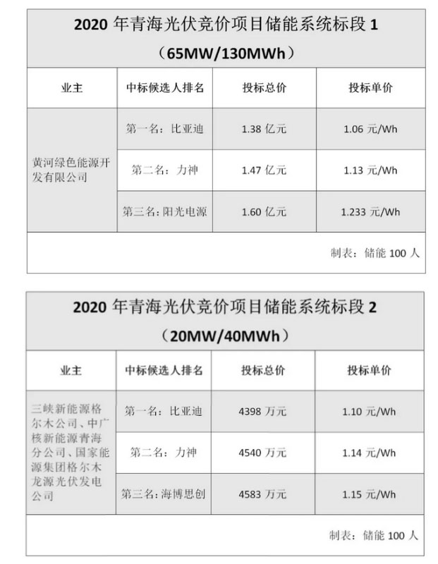 中國(guó)儲(chǔ)能網(wǎng)訊:11月16日,2020年青海光伏競(jìng)價(jià)項(xiàng)目對(duì)儲(chǔ)能系統(tǒng)采購(gòu)進(jìn)行公示,其中比亞迪最低價(jià)中標(biāo),獨(dú)攬兩大標(biāo)包,成為此次招標(biāo)的最大贏家。兩標(biāo)包中標(biāo)候選人大致如下: