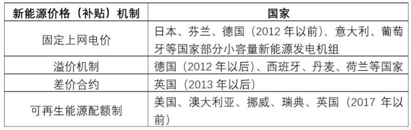 日本、芬蘭等國家實施固定上網(wǎng)電價機(jī)制,德國、意大利、葡萄牙等國通常只對容量較小的新能源發(fā)電機(jī)組實施。