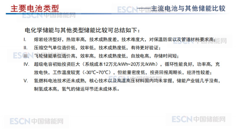 我們主流電池和其他形式儲(chǔ)能相比較,熔巖經(jīng)濟(jì)型比較好,熱效率比較高,技術(shù)成熟度比較差,技術(shù)難度大,對(duì)保溫防腐和管道材料要求高;壓縮空氣單價(jià)造價(jià)低,效率低,技術(shù)成熟度低;飛輪儲(chǔ)能造價(jià)高,效率高,但是存儲(chǔ)時(shí)間很短,有可能作為調(diào)頻應(yīng)用?,F(xiàn)在永德后備電源和動(dòng)能回收。超級(jí)電容投資非常大,但是循環(huán)性能好,功率高,充放電快,工作溫度廣,但是非常貴,不具有經(jīng)濟(jì)型。氫燃料電池是未來(lái)的技術(shù),十幾年后發(fā)展應(yīng)用,現(xiàn)在目前的核心技術(shù)還掌握在日本和德國(guó)手中,國(guó)內(nèi)的生產(chǎn)鏈條,沒(méi)有完整的產(chǎn)業(yè)鏈條,所以對(duì)于氫燃料電池還是摸索的階段。