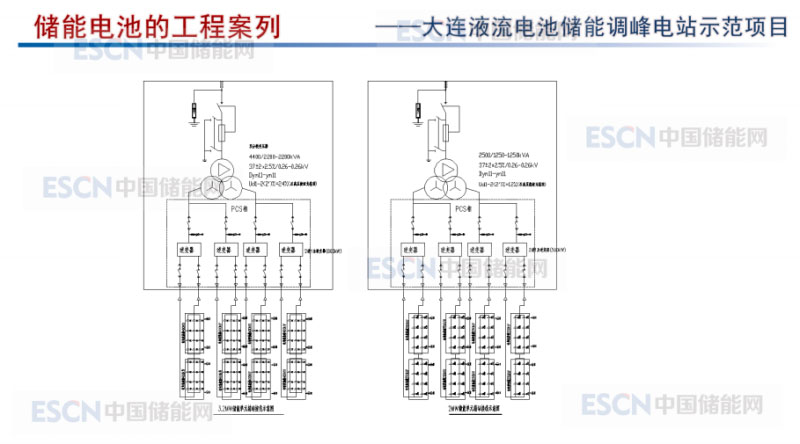 下面介紹的幾個(gè)案例。1、大連做的液流電池儲(chǔ)能調(diào)峰電站,位于大連市,總裝機(jī)容量200MW,工作建設(shè)規(guī)模200MW/800MWh,分兩期建設(shè),每期100MW/400MWh,總用用地面積5.25hm2。電池儲(chǔ)能系統(tǒng)是由儲(chǔ)能電池組、電池管理系統(tǒng)、儲(chǔ)能變流器及儲(chǔ)能電站監(jiān)控系統(tǒng)等設(shè)備組成,本工程建設(shè)的200MW/800MWH全釩液流電池組,每個(gè)儲(chǔ)能單元容量為25MW/100MWH。采用8串2并的方案,接至500KV儲(chǔ)能變流器。每25儲(chǔ)能變壓器串聯(lián)為25MW儲(chǔ)能單元,經(jīng)1回35KV集中變電站35KV母線。