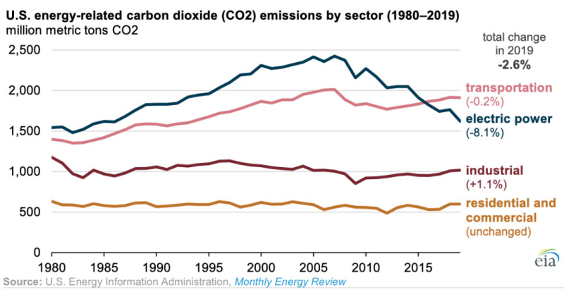 2019年,美國(guó)住宅和商業(yè)部門與能源消耗相關(guān)的二氧化碳排放量幾乎保持不變。由于工業(yè)產(chǎn)出的增加,工業(yè)部門的二氧化碳排放量增加了1.1%。運(yùn)輸部門的排放量減少了0.2%,打破了自2012年以來該部門排放量持續(xù)增長(zhǎng)的6年趨勢(shì)。