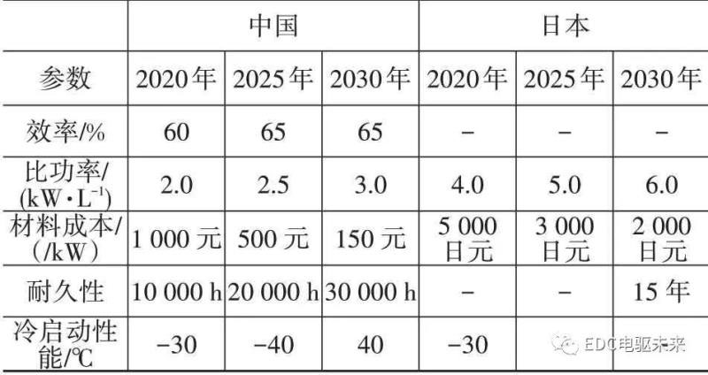 表1 各國燃料電池相關(guān)規(guī)劃中電堆性能指標(biāo)