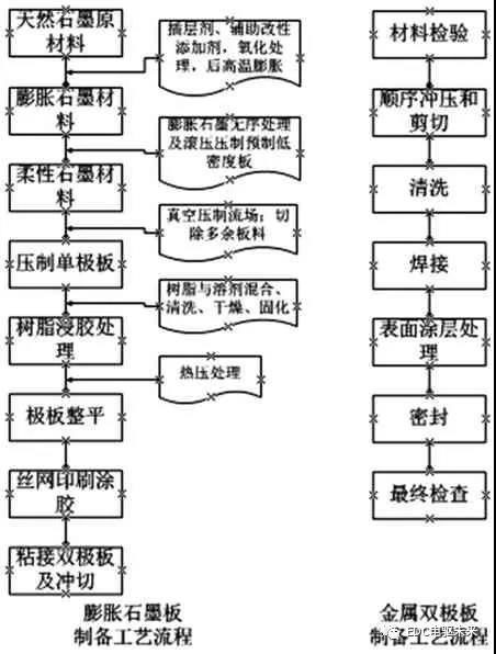 石墨雙極板的制造主要可分為數(shù)控機(jī)械加工和模壓2 種類型,另外少量采用注塑成型。其中模壓是將混合粉料加入預(yù)熱好的模具,固化后得到雙極板,因其適合大批量生產(chǎn),易于降低制造成本,目前應(yīng)用廣泛。近年來,以Ballard 柔性膨脹石墨板為代表的產(chǎn)品因其較為卓越的性能,也得到了廣泛的關(guān)注。金屬雙極板采用沖壓、液壓、輥壓成型等方式生產(chǎn),生產(chǎn)效率高,但需要解決流道加工和耐腐蝕鍍層等問題。典型石墨板和金屬板的加工工藝流程如圖3。