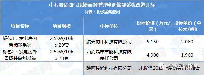 試油氣現(xiàn)場離網(wǎng)型鋰電池儲能系統(tǒng)改造項目共分兩個標(biāo)包,分別需采購2.5kW/25kWh儲能系統(tǒng)29套和28套,最高限價分別為156.6萬元和159.6萬元。結(jié)果顯示航天鈞和科技有限公司和西安晶屋節(jié)能科技有限責(zé)任公司獲得中標(biāo),兩者投標(biāo)單價約2.06元/Wh和1.96元/Wh。