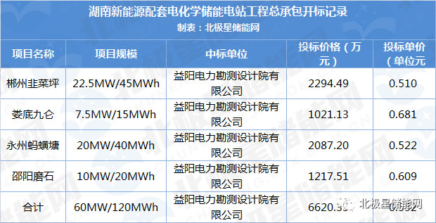 11月26日,湖南郴州韭菜坪等四個新能源配套電化學(xué)儲能電站工程總承包開標(biāo),結(jié)果顯示四個項目中標(biāo)候選人均為益陽電力勘測設(shè)計院有限公司,四個項目總投標(biāo)額達6620萬元。此次招標(biāo)不包含儲能電池等核心設(shè)備。