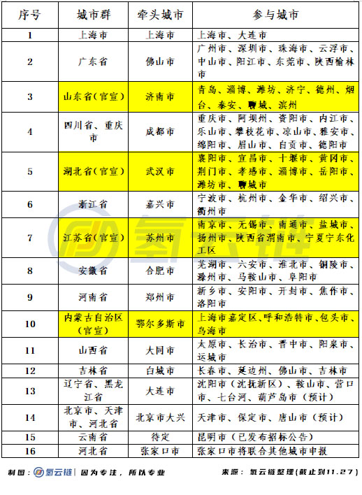 根據(jù)9月16日五部委下發(fā)《關于開展燃料電池汽車示范應用的通知》要求,燃料電池汽車示范應用城市群申報已經(jīng)正式截止(截止日為11月15日)。而從之前氫云鏈氫云鏈對各地申報整理的情況來看,在大陸31省市自治區(qū)中,已有超過半數(shù)申報了申報了燃料電池汽車城市群,全國各地都顯示出對燃料電池汽車發(fā)展極大的熱情,具體詳情見表1。