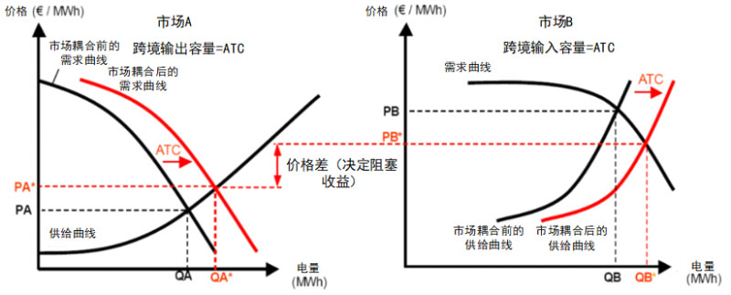 日前市場聯(lián)合出清不考慮各國(價(jià)區(qū))內(nèi)部輸電阻塞,僅考慮跨國(價(jià)區(qū))之間的輸電線路容量限制。由TSO向電力交易機(jī)構(gòu)發(fā)布跨境傳輸通道的可用傳輸容量(Available Transmission Capacity,ATC)。市場A和市場B的市場成員各自提交報(bào)價(jià),使用該傳輸容量作為約束進(jìn)行統(tǒng)一優(yōu)化出清,得到各自市場的成交電量及價(jià)格。在區(qū)域間有阻塞和無阻塞情況下各市場出清曲線如下圖所示: