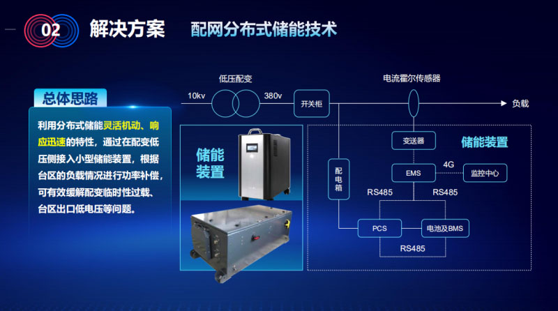 加大配電側(cè)分布式儲(chǔ)能技術(shù)的應(yīng)用,總體思路是利用分布式儲(chǔ)能靈活機(jī)動(dòng)、響應(yīng)迅速的特點(diǎn),通過在配變低渦側(cè)介入小型儲(chǔ)能裝置,根據(jù)臺(tái)區(qū)的負(fù)荷情況進(jìn)行功率補(bǔ)償,可以有效的環(huán)節(jié)配變以及臨時(shí)性過載,臺(tái)區(qū)出口低電壓等一系列的問題。