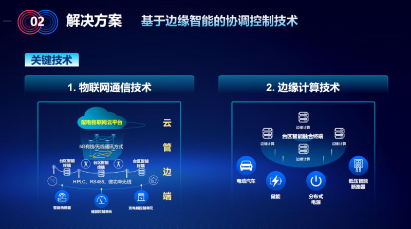 基于邊緣智能的協(xié)調(diào)控制技術(shù),以配網(wǎng)分布式儲(chǔ)能技術(shù)為基礎(chǔ),利用臺(tái)區(qū)側(cè)智能終端設(shè)備的邊緣計(jì)算能力,通過與配網(wǎng)儲(chǔ)能裝置,電動(dòng)汽車充電樁、分布式電源的實(shí)時(shí)交互及協(xié)調(diào)控制。通過多個(gè)終端與云主站的“云邊協(xié)同”還可以進(jìn)一步實(shí)現(xiàn)區(qū)域級(jí)甚至網(wǎng)絡(luò)級(jí)的能源優(yōu)化及管理。