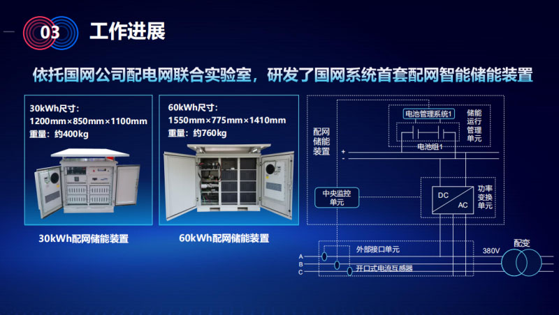 對(duì)配網(wǎng)側(cè)的裝置做了研究研發(fā)和應(yīng)用。 依托國(guó)網(wǎng)公司配電網(wǎng)聯(lián)合實(shí)驗(yàn)室,研發(fā)了國(guó)網(wǎng)系統(tǒng)首套配網(wǎng)智能儲(chǔ)能裝置:30kWh和60kWh兩套裝置,裝置本身具有三大技術(shù)特點(diǎn),或者是設(shè)計(jì)的三大原則。