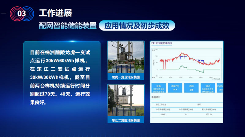 目前做了30千瓦時(shí)和60千瓦時(shí)兩臺(tái)樣機(jī),在現(xiàn)場(chǎng)進(jìn)行試點(diǎn)應(yīng)用,其中株洲醴陵龍虎一變臺(tái)區(qū)也是有針對(duì)性的,負(fù)荷很重,在過夏的時(shí)候過載率也達(dá)到了130%,峰值到了150%,把這裝置裝上去之后,從圖上可以看出受到了很好的削峰填谷的效果,在裝置裝上去之后,7月份裝的,配電和臺(tái)區(qū)供電得到了很好的保障,沒有因?yàn)橹剡^載而導(dǎo)致的燒損和其他供電鼓掌。