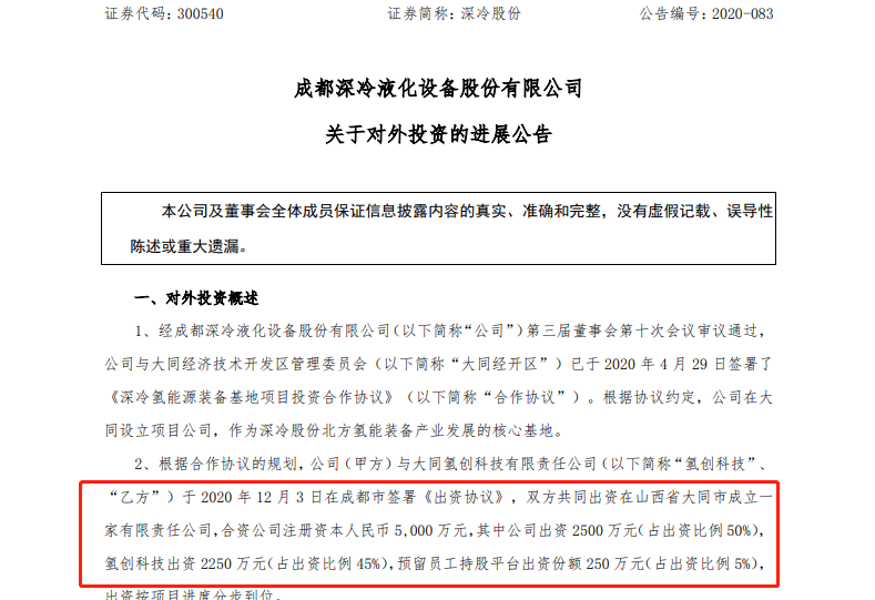 根據(jù)合作協(xié)議的規(guī)劃,公司(甲方)與大同氫創(chuàng)科技有限責任公司(“氫創(chuàng)科技”、“乙方”)于2020年12月3日在成都市簽署《出資協(xié)議》,雙方共同出資在山西省大同市成立一家有限責任公司,公司名稱:山西深冷氫能科技發(fā)展有限公司(暫定名),合資公司注冊資本人民幣5000萬元,其中公司出資2500萬元(占出資比例50%),氫創(chuàng)科技出資2250萬元(占出資比例45%),預(yù)留員工持股平臺出資份額250萬元(占出資比例5%),出資按項目進度分步到位。