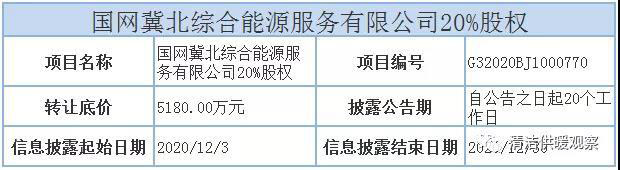 從披露的項目信息來看,國網(wǎng)冀北綜合能源服務有限公司20%股權轉讓底價為5180萬元,信息披露起始日期為2020年12月03日,信息披露結束日期為2020年12月30日。