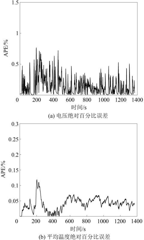 圖8記錄了TCSP2D模型較P2D模型的電壓、平均溫度的絕對(duì)百分比誤差(absolute percentage error,APE)曲線。