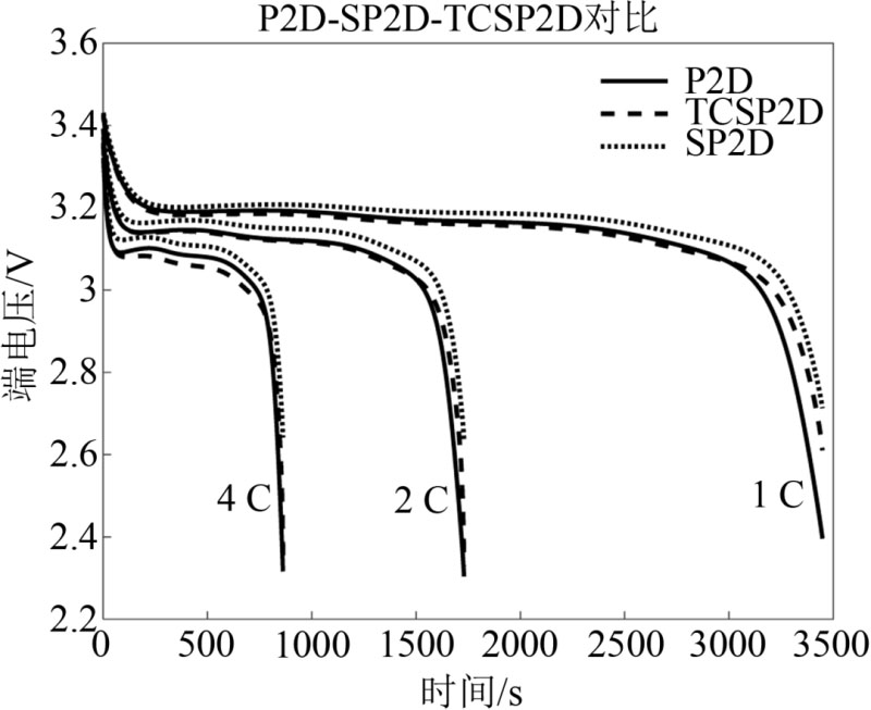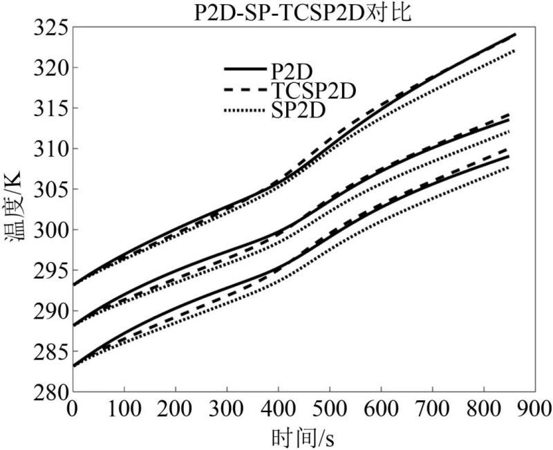 圖5是初始溫度為25 ℃、不同倍率、恒流放電工況的電壓對(duì)比,可以看出,TCSP2D模型更加接近P2D模型電壓曲線。電化學(xué)模型中的擴(kuò)散系數(shù)、電化學(xué)反應(yīng)速率常數(shù)與溫度系數(shù)都會(huì)對(duì)端電壓產(chǎn)生影響,SP2D默認(rèn)這些量為初始溫度下的常值,故會(huì)產(chǎn)生偏差。