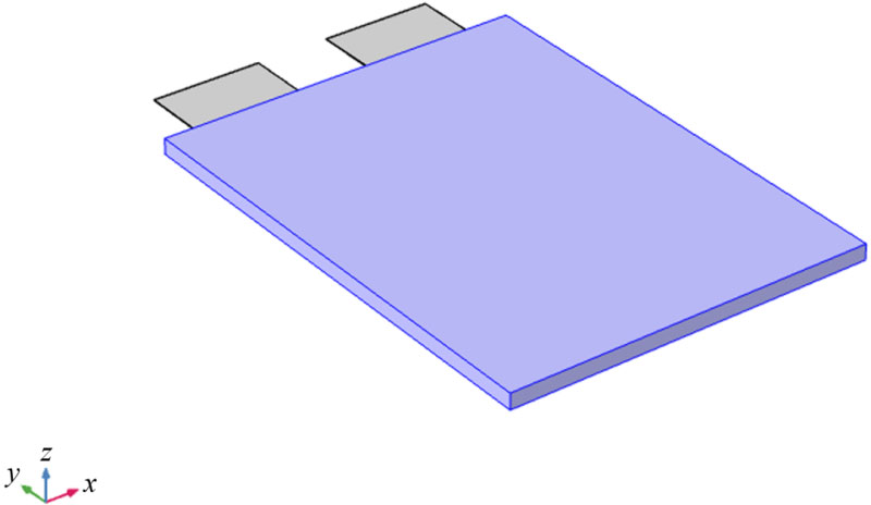圖3為軟包鋰離子電池的三維結(jié)構(gòu),上述的簡(jiǎn)化模型與電芯溫度相關(guān)。由于極耳面積相對(duì)較小,為計(jì)算方便,本文在計(jì)算產(chǎn)熱時(shí)考慮極耳發(fā)熱,忽略極耳散熱。