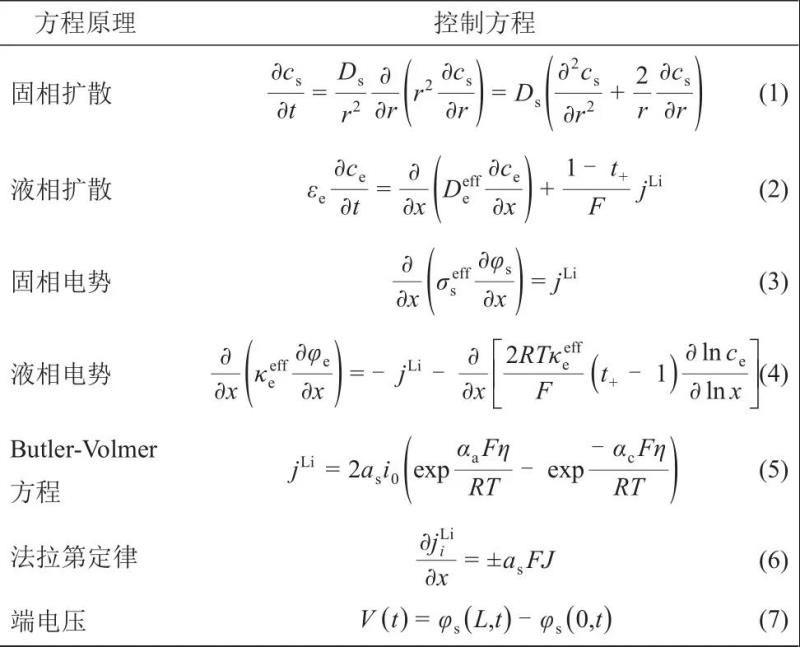 鋰離子的擴(kuò)散、遷移過(guò)程可以用偏微分方程描述,按原理可分為7類(lèi),具體的控制方程見(jiàn)表1。給定輸入電流,即可得到端電壓、鋰離子濃度等值,由于偽二維模型經(jīng)過(guò)充分的測(cè)試和研究,在沒(méi)有試驗(yàn)測(cè)量數(shù)據(jù)的時(shí)候,一般將偽二維模型的仿真結(jié)果作為標(biāo)準(zhǔn)值。本文的靜態(tài)參數(shù)見(jiàn)表2,動(dòng)態(tài)參數(shù)見(jiàn)表3,參數(shù)均來(lái)源于文獻(xiàn)[14-16]。