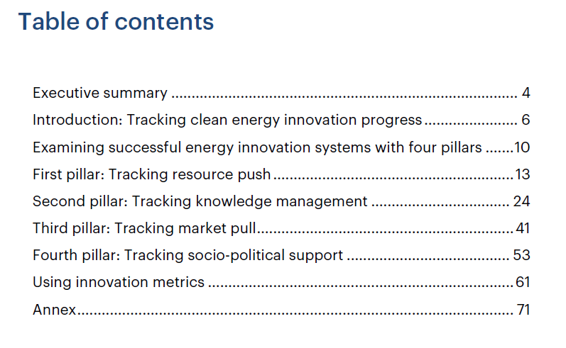 報(bào)告中給出的各種指標(biāo),是政府和公司所提議或在實(shí)施的指標(biāo),這些指標(biāo)可從各種來源以及與從業(yè)人員的對(duì)話中找到。報(bào)告中還提供有一些示例,反映出了現(xiàn)有數(shù)據(jù)中得到的諸多見解。但是,更大的機(jī)會(huì)在于將新的追蹤策略和功能納入到清潔能源創(chuàng)新政策中,這也是能源政策制定的核心。