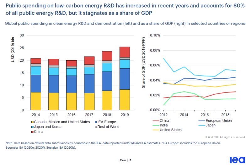 近年來低碳能源研發(fā)方面的公共支出有所增加,占所有公共能源研發(fā)的80%,但在GDP中所占比例卻停滯不前。上圖為幾個(gè)選定國(guó)家或地區(qū)在清潔能源研發(fā)和示范方面的全球公共支出(左)以及占GDP的比例(右)。