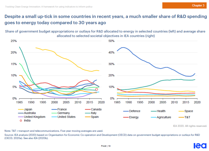 盡管近年來一些國(guó)家的能源研發(fā)投入還有小幅上漲,但與30年前相比,如今的能源研發(fā)支出份額要小得多。左圖為選定國(guó)家分配給能源的政府預(yù)算撥款或研發(fā)支出的份額,右圖為IEA成員國(guó)家在各特定社會(huì)目標(biāo)上獲得的平均研發(fā)投入份額。