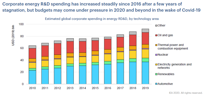 在經(jīng)歷了幾年的停滯之后,企業(yè)能源研發(fā)支出自2016年以來一直保持穩(wěn)定增長(zhǎng),但是在2020年新冠疫情發(fā)生之后,預(yù)算可能會(huì)受到壓縮。上圖為按技術(shù)領(lǐng)域分列的全球企業(yè)在能源研發(fā)方面的估計(jì)支出??稍偕茉吹谋戎剡€太小。