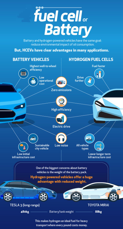 中國儲能網(wǎng)訊:The Visual Capitalist 網(wǎng)站制作信息圖比較燃料電池汽車與純電動汽車的優(yōu)劣。在日常使用中,這兩種選擇都可以實現(xiàn)零排放、高效率、電動驅動和低噪音。相比之下,氫燃料電池提供了電池驅動汽車所不具備的重量節(jié)省優(yōu)勢。豐田的Mirai的最大行駛里程為312英里,比特斯拉的3型220英里的行駛距離多41%。Mirai可以在幾分鐘內(nèi)加油,而Model 3滿充需要8.5小時(在一個特殊配置的快速充電站,充電率僅為45%)。