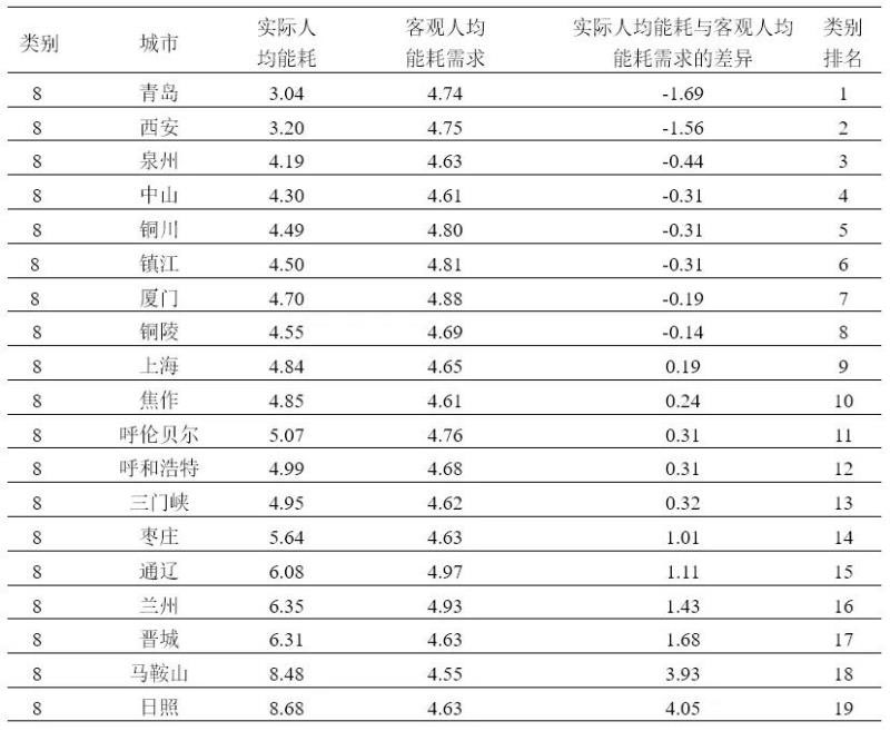 相比于客觀人均能耗需求的4.68噸標(biāo)準(zhǔn)煤/人,青島市實(shí)際人均能耗為3.04噸標(biāo)準(zhǔn)煤/人,低于客觀人均能耗需求4.68噸標(biāo)準(zhǔn)煤/人。在同類別其他城市中,青島市實(shí)際人均能耗低于客觀人均能耗需求最為顯著,提示該城市在除客觀因素外的其他方面的表現(xiàn),是明顯優(yōu)于其他城市平均水平的。