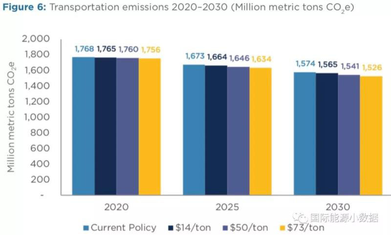 第二,碳稅對(duì)電力部門的煤電廠影響最大(煤電廠加速退役),到2030年因?yàn)樘级悓?shí)現(xiàn)的減排量中80%來(lái)自電力部門。如果碳稅為50美元/噸,那么2030年電力部門碳排放為6.76億噸,比沒(méi)有碳稅的情境下的排放量降幅達(dá)61%。而50美元/噸的碳稅對(duì)于交通部門的減排量影響非常小(-2%)。