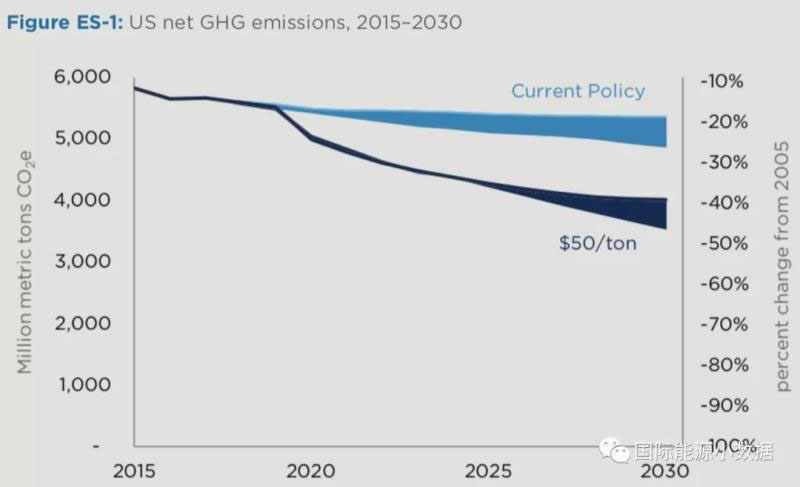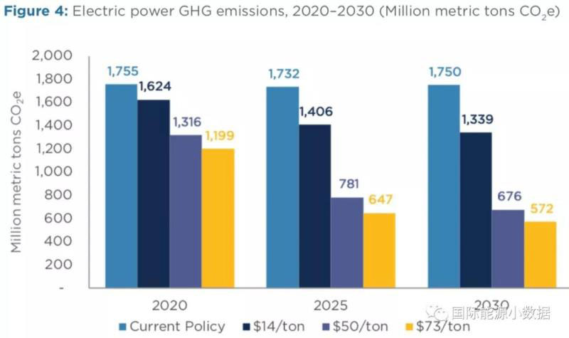 第一,碳稅有助于減排,但是需要達(dá)到較高的碳價(jià)水平才能充分發(fā)揮作用。如果碳稅達(dá)到50美元/噸的時(shí)候,美國(guó)2025年代碳排放量將比2005年下降39%-46%(美國(guó)奧巴馬政府的減排目標(biāo)是26%-28%)。如果2050年代減排目標(biāo)是比2005年下降80%,那么屆時(shí)碳稅需要超過(guò)100美元/噸。