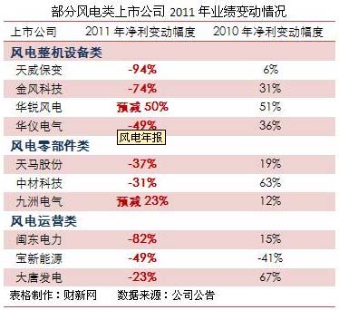 據(jù)中國風能協(xié)會(CWEA)統(tǒng)計數(shù)據(jù),2011年金風科技和華銳風電的裝機容量分列國內(nèi)同行業(yè)的前兩名,兩企業(yè)的市場份額合計37%。兩家企業(yè)的業(yè)績下滑,反映不僅整機制造企業(yè)業(yè)績下滑,風電零部件企業(yè)、風電運營企業(yè)也均出現(xiàn)業(yè)績下滑或增幅縮窄。