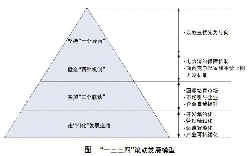 隨著平價(jià)上網(wǎng)時(shí)代的加速到來(lái),原本相對(duì)粗放式的發(fā)展模式面臨全新挑戰(zhàn),新能源投資業(yè)務(wù)要實(shí)現(xiàn)滾動(dòng)發(fā)展,必須改變傳統(tǒng)的投資模式與體制機(jī)制。立足于國(guó)家最新宏觀調(diào)控政策環(huán)境和能源轉(zhuǎn)型發(fā)展趨勢(shì),筆者提出“一三三四”滾動(dòng)發(fā)展模型,以期促進(jìn)形成滾動(dòng)發(fā)展長(zhǎng)效機(jī)制(見(jiàn)圖)。