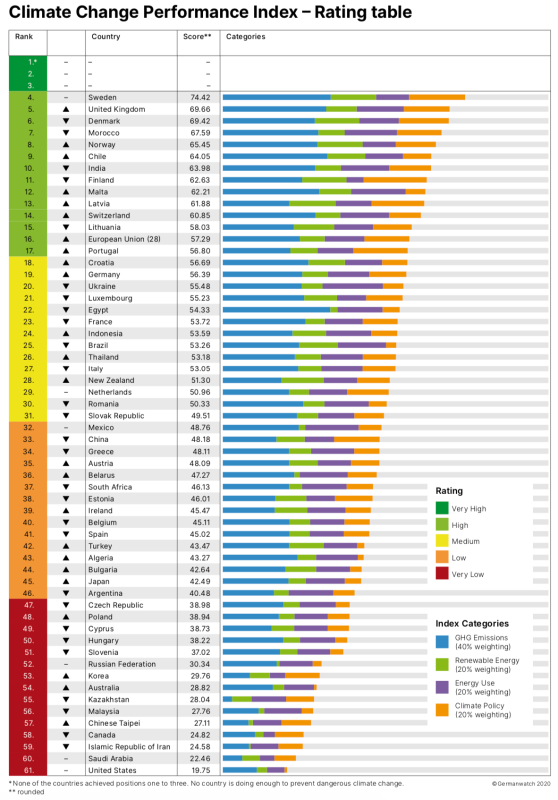中國儲能網(wǎng)訊:德國觀察組織、新氣候研究所、氣候行動網(wǎng)絡(luò)跟蹤和評估57個主要碳排放國和地區(qū)的氣候政策,自2005年起編制并發(fā)布的年度氣候變化績效指數(shù)(CCPI)。這一指標(biāo)旨在提高國際氣候政治的透明度,使各國的氣候保護努力和進展能夠進行比較。CCPI指數(shù)綜合考慮以下四個類別的因素: