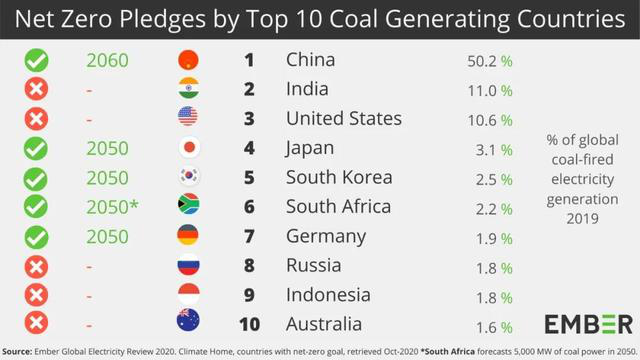 根據(jù)Ember Global Electricity Review Match 2020 報告,在全球十大煤電國家中,中國、日本、韓國這三個東亞國家分別位居第一、四、五位。他們也先后提出“碳中和”的實現(xiàn)目標(biāo)時間。