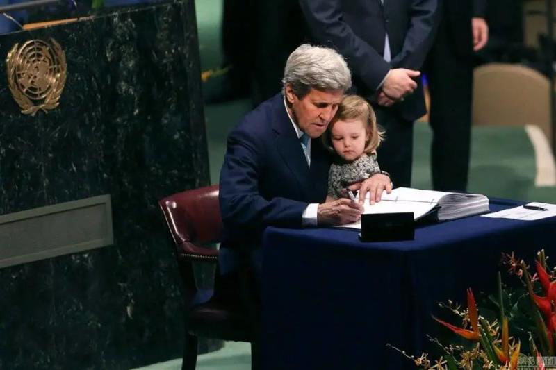 2016年,時任美國國務(wù)卿克里抱著孫女簽署了《巴黎協(xié)定》