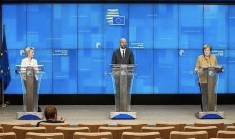 12月11日,在比利時布魯塞爾的歐盟總部,歐盟委員會主席馮德萊恩、歐洲理事會主席米歇爾和德國總理默克爾(從左至右)在歐盟冬季峰會結(jié)束后出席線上聯(lián)合記者會。新華社發(fā)(歐盟供圖)