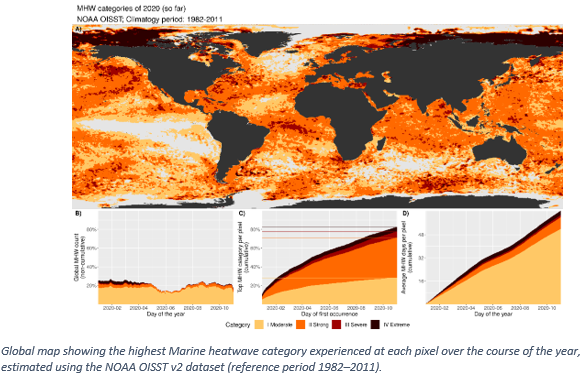 這份名為“2020年全球氣候狀況”的臨時(shí)報(bào)告指出,2020年,海洋熱量處在創(chuàng)紀(jì)錄的水平,全球80%以上的海洋均在某些時(shí)段經(jīng)歷了海洋熱浪,對(duì)已因吸收二氧化碳而遭受更多酸性水域的海洋生態(tài)系統(tǒng)產(chǎn)生了廣泛影響。