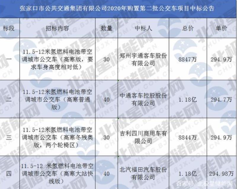 中國儲能網(wǎng)訊:12月14日,張家口市公共交通集團有限公司公布了2020年購置第二批公交車項目中標公告,四個標段共計140輛氫燃料電池公交車,鄭州宇通、中通、吉利四川商用車、北汽福田分別獲得中標,中標總價4.13億元。