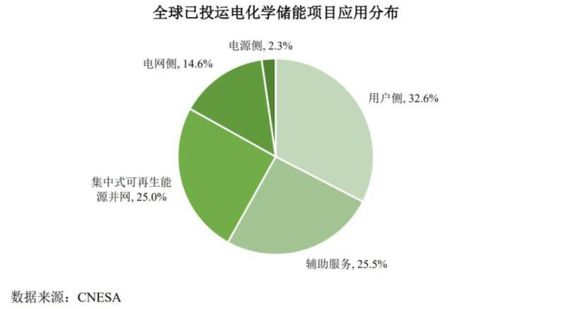 根據(jù)CNESA的統(tǒng)計(jì)數(shù)據(jù),截至2018年底,全球電力系統(tǒng)新增投運(yùn)電化學(xué)儲(chǔ)能項(xiàng)目裝機(jī)規(guī)模約3.7GW,累計(jì)達(dá)到6.6GW。從應(yīng)用分布看,用戶側(cè)領(lǐng)域的累計(jì)裝機(jī)規(guī)模最大,占比32.6%;輔助服務(wù)、集中式可再生能源并網(wǎng)、電網(wǎng)側(cè)和電源側(cè)分列二至五位,所占比重分別為25.5%、25.0%、14.6%和2.3%(如下圖所示)。