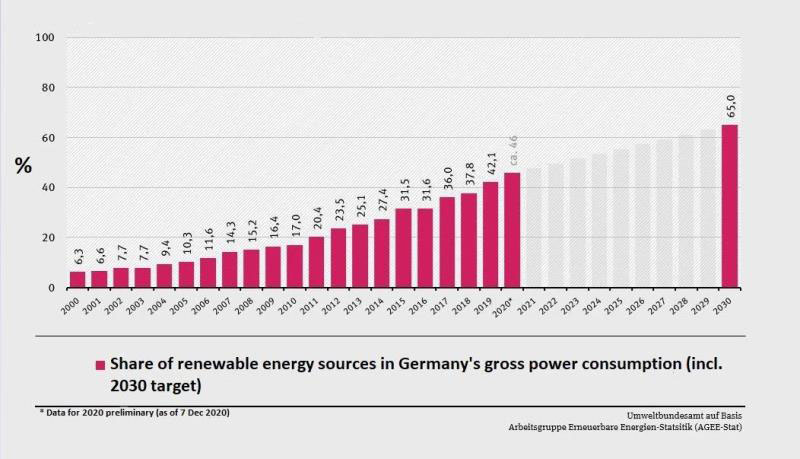 中國儲能網(wǎng)訊:據(jù)德國能源工業(yè)協(xié)會BDEW和太陽能與氫研究中心Baden Wuerttemberg(ZSW)公布的初步數(shù)據(jù)顯示,2020年可再生能源發(fā)電將占德國電力消費的46%以上,與前一年相比增加了4個百分點。