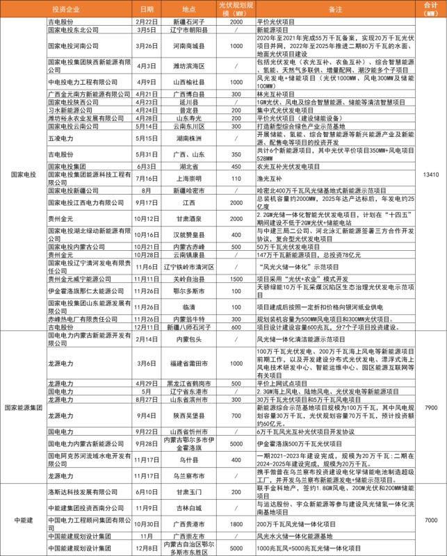 值得注意的是,這些項(xiàng)目多為“風(fēng)光+儲能”項(xiàng)目配置且容量較大,而項(xiàng)目投資企業(yè)大多涉及國家電投、中能建、國家能源集團(tuán)、中廣核、中核、三峽等家央企/國企。