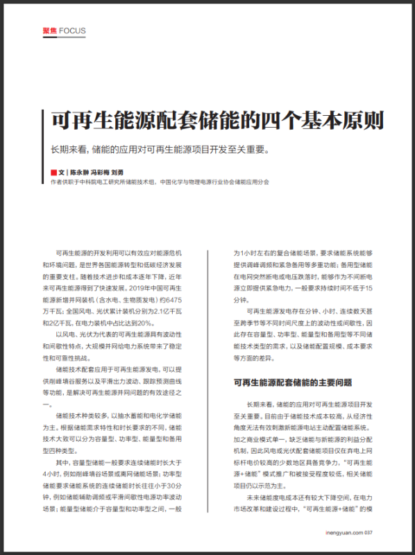 可再生能源發(fā)電在電力系統(tǒng)中的占比會持續(xù)增加,儲能系統(tǒng)的配置可以有效解決棄風(fēng)棄光及可再生能源并網(wǎng)帶來的電力系統(tǒng)穩(wěn)定性和靈活性問題。目前儲能成本較高、收益模式尚不完善,可再生能源配套儲能尚處于初期探索階段。儲能系統(tǒng)在可再生能源發(fā)電中的應(yīng)用首先是解決波動性問題,未來成本下降后可進一步解決可再生能源發(fā)電的間歇性問題。可再生能源配套儲能的發(fā)展過程中,建議遵循上述四個基本原則,以避免盲目性和資源浪費,促進儲能產(chǎn)業(yè)的健康發(fā)展。