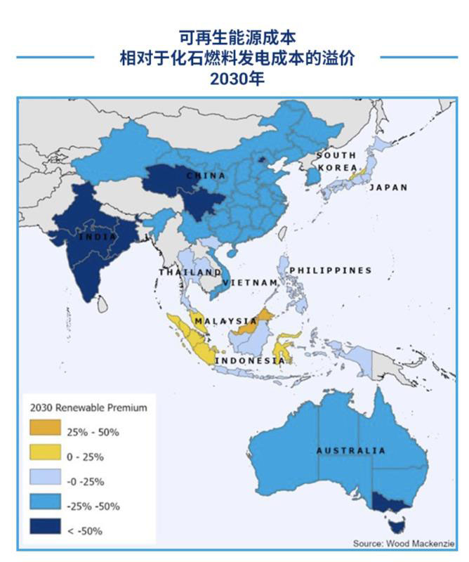 預(yù)計(jì)2030年前,亞太區(qū)域新建可再生能源項(xiàng)目的平均投資水平將比新建煤電廠低23%。自2019年以來,可再生能源平均發(fā)電成本已實(shí)現(xiàn)低于燃?xì)獍l(fā)電成本,但當(dāng)前水平較煤電仍高出16%。