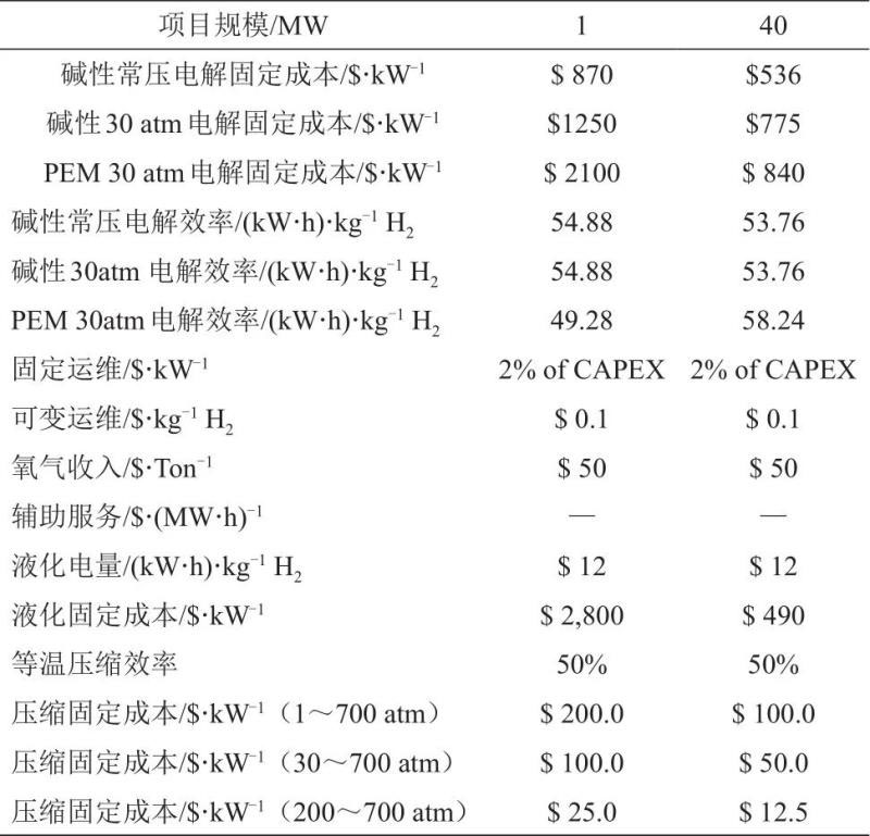 由于國內(nèi)仍無成熟的規(guī)?;疨EM電解技術(shù),為了便于比較,我們采用了國際知名公司電解裝置(如NEL、McPhy與GINER),以美元計價對電解制氫成本進行分析。表2總結(jié)了不同評估工廠的技術(shù)成本和性能系數(shù),對30 atm,40 MW 的PEM電解裝置,由于缺乏官方報價,固定成本支出是根據(jù)1 MW系統(tǒng)將容量擴大到40 MW時的成本減少額(約60%)來確定的,就壓縮機而言,大型系統(tǒng)的固定成本支出假定為1 MW系統(tǒng)固定成本支出的50%。